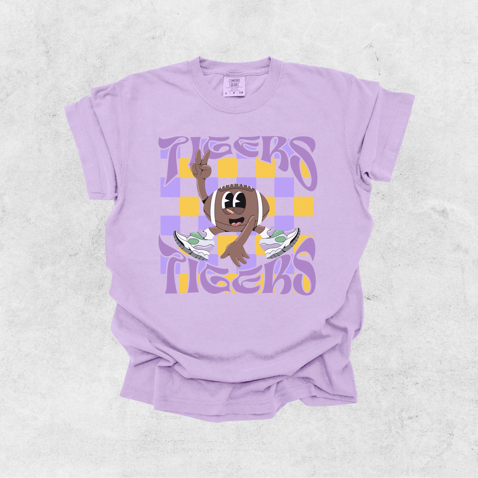 Featuring a bold vintage checkered background and an adorable throwback-style football character front and center, this tee brings the perfect mix of charm and nostalgia. Whether you're tailgating, cheering from the stands, or just repping your team in style, this comfy unisex fit will have you looking like a total touchdown. Pair with jeans, boots, or a denim jacket for the ultimate game day look!