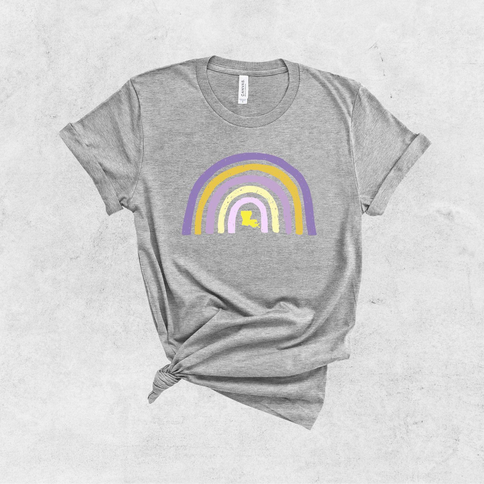 Because rainbows are just more fun in purple and gold! Complete with a small Louisiana icon, this shirt is a favorite for any day of the week. Also available in youth and toddler sizes..
